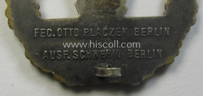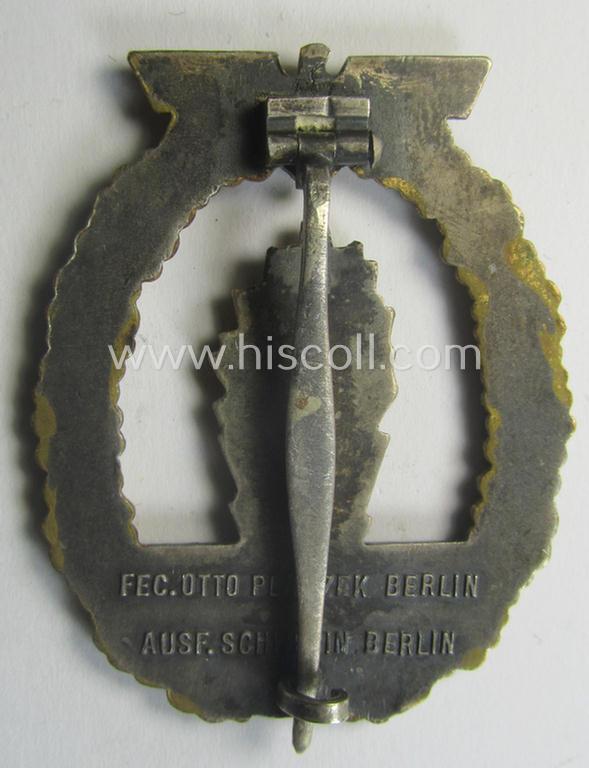 This is a very attractive - and truly 'high-quality'-produced! - example of a WH (Kriegsmarine) so-called: 'Kriegsabzeichen für Minensuch-, U-Boot-Jagd und Sicherungs-Verbände' (or: mine-sweeper war-badge) being a very detailed and clearly maker-marked example as was executed in multi-coloured 'Buntmetall' and that was produced by the maker: 'Schwerin - Berlin' and that comes in an overall very nice- (ie. just moderately used- ie. worn-), condition. The award is (I deem) a fairly early-war-period produced specimen that has retained great pronounced detail. It comes naturally mounted onto its functional (and/or neatly vertically-mounted- and/or: 'flattened'- ie. flute-shaped pin-, typical catch and/or typical pin-attachment (as can be seen on the pictures). The piece was most certainly never cleaned ie. polished and truly retains most (ie. all!) of its golden- and/or silver-coloured finish: just some regular wear and/or age is visible. Its shows the clearly present (and expected!) super-imposed: 'Fec. Otto Placzek Berlin - Ausf. Schwerin - Berlin'-designation on its back (as can be noticed on the pictures). Simply a very attractive KM-war-badge that comes in just a minimally worn and/or fully untouched condition: one of the nicest such examples I ever had on offer for quite some time!