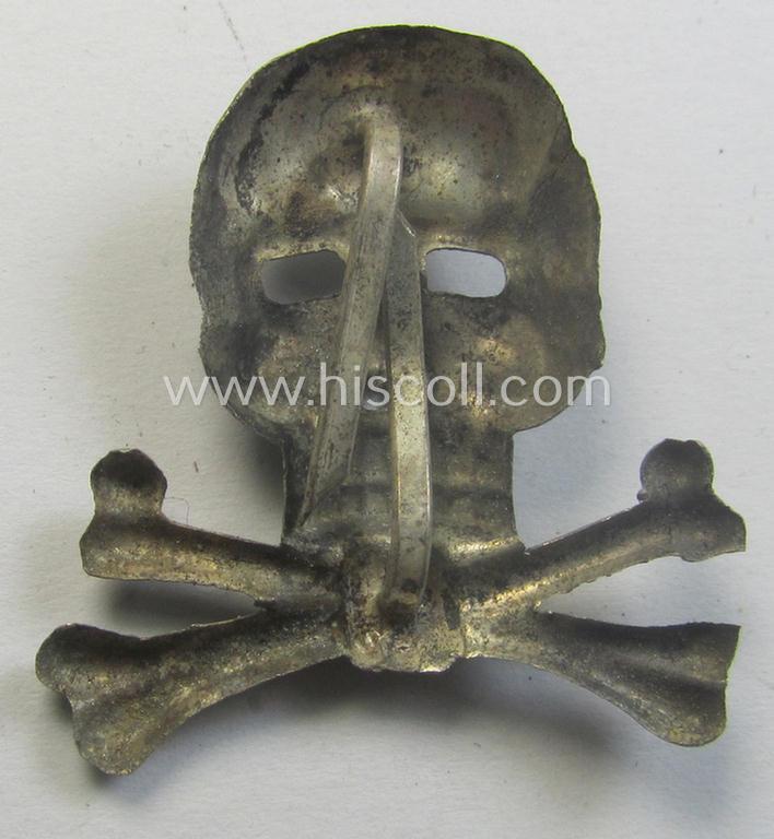 This is an attractive - and actually quite scarcely encountered! - so-called: 'Truppentraditionsabzeichen' (ie. 'Braunschweiger Traditions-Totenkopf für die Schirmmütze des Infanterie-Regiments 17 und Kavallerie-Rgts. 13) being a detailed example as was executed in silverish-grey-coloured zinc-based metal (ie. 'Feinzink') and that comes in an overall very nice- (ie. I deem hardly ie. never used- nor once visor-cap attached-), condition. The piece - which is totally void of any makers'-mark as more often - comes mounted on both its (still fully functional) silver-toned prongs (as can be seen on the pictures). The piece is just a tiny bit stained- ie. dirty but was never cleaned nor polished. Simply a very attractive - and naturally 100% genuine! - 'Truppentraditionsabzeichen' (ie. 'Braunschweiger Traditions-Totenkopf') that is with certainty accordingly priced!