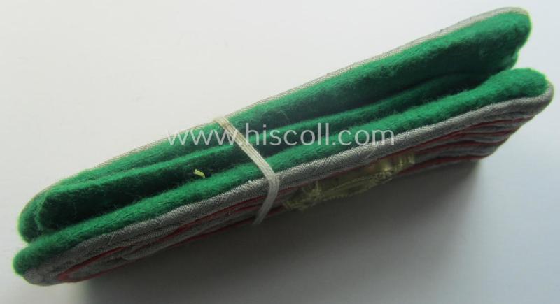 This is a truly very attractive - and/or fully matching and with certainty very rarely encountered! - pair of WH (Luftwaffe) neatly 'cyphered', officers'-pattern shoulderboards as piped in the bright-green- (ie. 'grüner'-) coloured branchcolour as was specifically intended for usage by air-force musicians- ie. band-leaders (or: 'Musikmeister im Offiziersrang') and that comes in overall very nice- (I deem simply never issued- nor worn ie. still 'virtually mint'-), condition. The attractive shoulderboards - which are constructed from the silver- and bright-red- (ie. 'hochroter'-) coloured 'braid' and having the bright-green-coloured- and/or woolen-based 'underlays' - come in a stonemint (and still tied-together!) condition. The 'upperdecks' show the (obligatory) integrated 'stripes' of bright-red-coloured 'braid' as to be expected. The shoulderboards - which measure approximately 10,5 cms. in length each - show two identical (neatly bright-golden-toned- and/or matching-) so-called: 'Lyra'-cyphers period-attached (which both retain most of their golden-bronze toned finish) and were as such intended for an officer with the rank of a: 'Leutnant' (ie. lieutnant). The boards come with their typical officers'-type tongues attached (as can be seen on the pictures). Simply an attractive - and truly rarely encountered! - 'Luftwaffe'-related, officers'-type shoulderboard-pair that is not that often offered for sale. Only the first such rare shoulderboard-pair in this rank ie. branchcolour I ever had on offer!