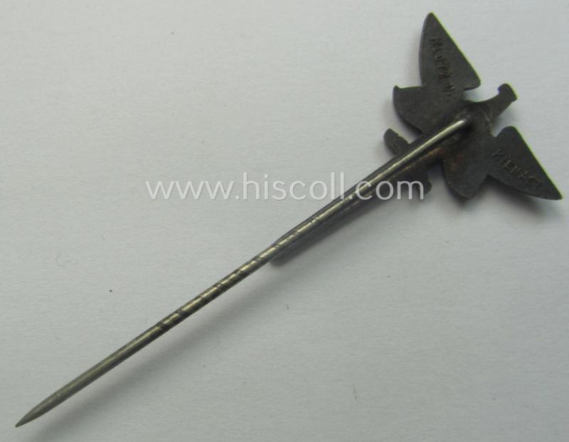 The attractive - and actually not that easily encountered! - lapel-pin is made out of typical darkened bronze-toned metal (ie. I deem 'Buntmetall') and comes mounted onto its functional, long-sized (and silver-toned) pin as worn and/or issued. It only shows some minimal aging caused by regular usage and/or wear (it is totally undamaged and retains a fully preserved and/or detailed surface, without showing any damage nor heavy worn areas). The tiny piece - that shows an eagle-device, sword and/or scales-design with swastika - is as stated above a neatly maker-marked example which does show the makers'-designation: 'Klotz u. Kienast' on its back (as can be seen on the pictures). A similar badge is also figured in the 'Heering-Hüsken'-lapel-pin-catalogue, wherein it is given a unique reference-number (3602A) and an estimated value of 100 Eu. Simply an attractive B.N.S.D.J.-membership-badge or: 'Mitgliedsabzeichen' that signified membership within one of the lesser-known TR-organisations!