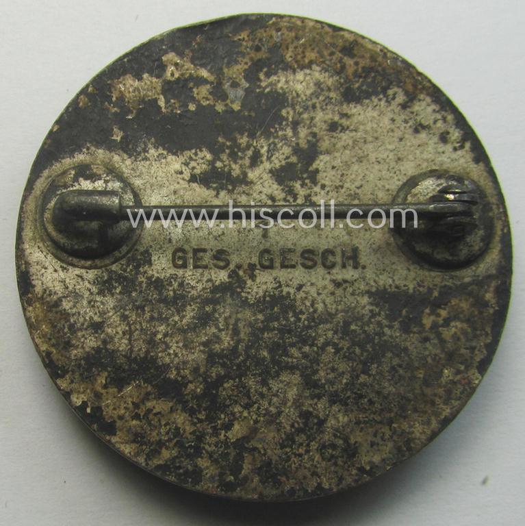 The attractive - clearly used but nevertheless nicely preserved! - silvered 'Buntmetall'-based, so-called: DRK (ie. 'Deutsches Rotes Kreuz' or German Red Cross) nurses'-helpers ie. 'Schwesternhelferin'-badge is made out of (minimally darkened- ie. somewhat tarnished) silverish-grey-coloured- (and truly nicely enamelled!) 'Buntmetall' and has a truly immaculate enamelled surface (no damage can be noticed: just some obvious wear-marks are present and/or visible: moreover, is just a tiny bit dirty ie. stained). The badge is a non-maker-marked example that does show a clear: '1 - Ges.Gesch.'-patent-pending-designation on its back (as can be seen on the photos). The badge is only moderately used and/or worn: it was never cleaned nor polished and comes of course mounted onto its functional pin- ie. pin/catch (-set-up). A similar example is also figured in the Heering-Hüsken lapel-pin-catalogue, wherein it is given the unique reference-number: '5613XB'. These attractive DRK-badges were also worn by the Germanic ie. European volunteers. Simply an attractive 'Buntmetall'-based example that will be hard to be upgraded and that is I deem accordingly priced!