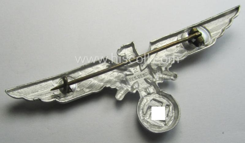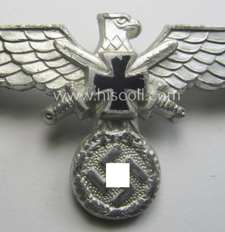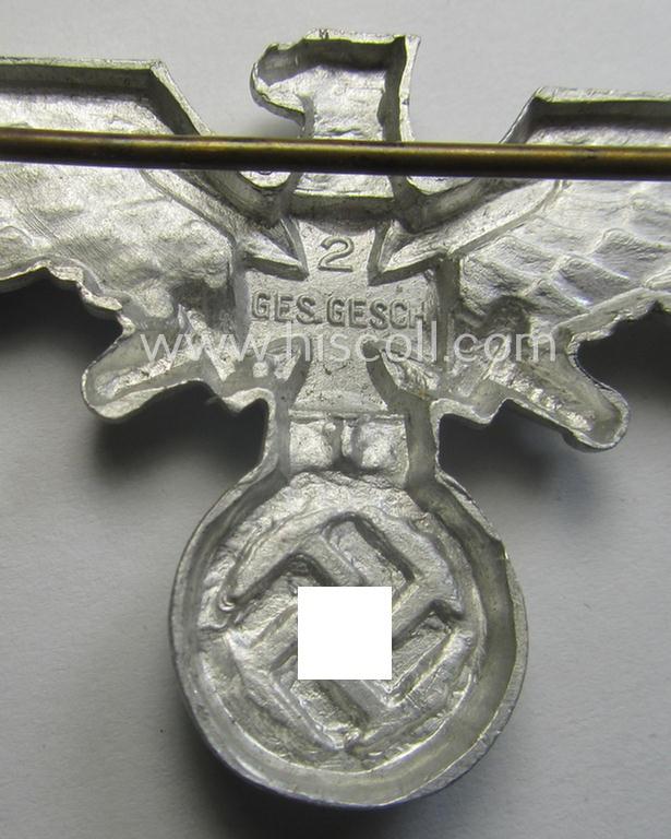 This is a truly very detailed example of a bright-silver-toned, aluminium-based (ie. 'molded') so-called: D.R.K.B. (or: 'Deutscher Reichskriegerbund' aka 'Kyffhäuserbund') enlisted-mens'- (ie. NCO-) type breast-eagle (showing a black-coloured- and neatly enameled iron cross-symbol) and that comes in an overall very nicely preserved- ie. moderately used- ie. worn-, condition. The piece shows a clearly present makers'-designation (that just reads: '2 - Ges.Gesch.') and comes mounted onto its (fully functional- and/or: typical copper-toned) pin- ie. pin/catch set-up. The piece - which is very detailed and/or pronounced - has a very nice somewhat 'shiny' appearance (but was never cleaned and shows a virtually undamaged, enameled iron cross-symbol as can be clearly seen on the pictures). It should be noted that these D.R.K.B.-breast-eagles as executed in silver-toned, aluminium are not that commonly encountered!