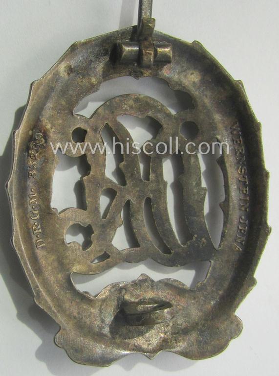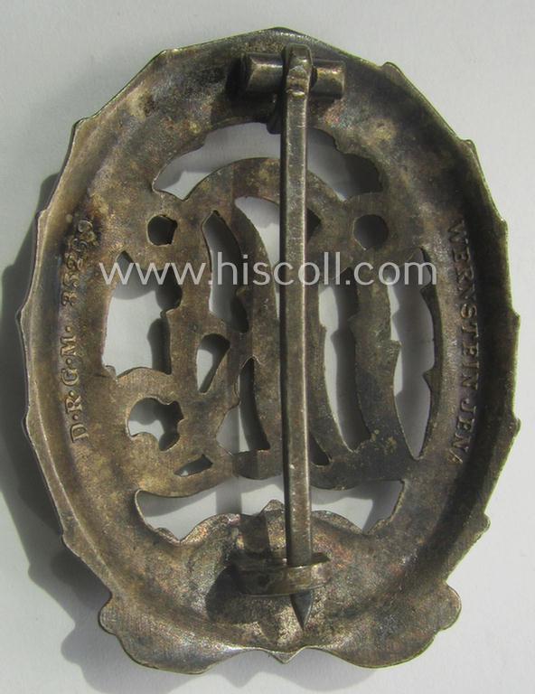 'Reichssportabzeichen DRL in Silber' (or: DRL sports'-badge in silver) being a just moderately worn- ie. used example that is nicely maker- (ie. 'Wernstein - Jena'-) marked on its back