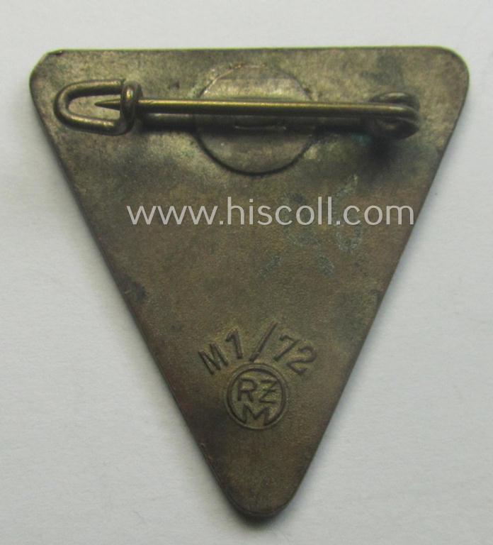 This particular enamelled (female-leaders) membership-badge (ie. 'Mitgliedsabzeichen') was intended to signify membership within the German Womens'-Association (or: in German-language: 'NS Frauenschaft Organisation'). The example on offer here concerns a version that was intended for a leading staff-member with the rank: 'Mitarbeiterin im Stab einer Ortsgruppe' (something that can easily be deducted from the enamelled light-blue-coloured 'inner-border' as can be seen on the pictures). The badge comes in an overall very nice and only minimally used- ie. worn, condition: the enamelled surface shows some minimal scratches and usage-marks but has truly no enamel damage whatsoever. The badge is nicely: 'RzM - M1/72'-marked on its back and comes mounted onto its functional pin- ie. pin/catch-set-up (as can be seen on the pictures). A similar example is also figured in the 'Heering-Hüsken'-lapel-pin-catalogue, wherein it is given a unique reference-number (9125MA). Simply an attractive - and actually not that commonly encountered! - neatly enamelled, leaders 'NS-Frauenschaft-Mitgliedsabzeichen'!