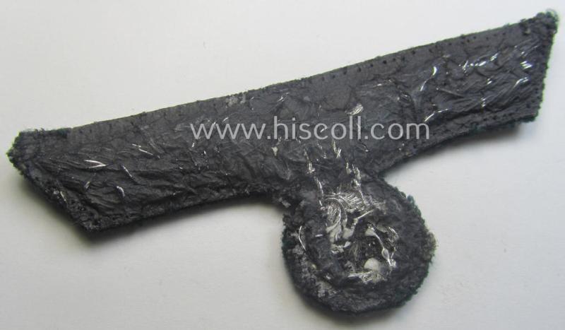 This is an attractive - and with certainty used and/or carefully tunic-removed but regrettably period-denazified! - example of a WH (Heeres) officers'-type, hand-embroidered- (and truly very detailed!) army-type breast-eagle (ie. 'Brustadler für Offiziere des Heeres') being executed in bright-silverish-coloured braid on a darker-green-coloured- and/or 'smooth'-woolen-based background and that comes in an overall nice- (and as stated above carefully tunic-removed-) and/or regrettably denazified, condition. This example - having a length ie. 'wingspan' of approximately 10 cms. - is very nicely hand-embroidered using (bright) silverish-coloured 'braid' on a darker-green-coloured (and/or woolen-based-) background and does show some 'high-lighted'-areas as executed in beige-silver-coloured thread (as can be seen on the pictures). The eagle - which is void of a makers'-designation as more often and that does show minimal usage and wear as can be noticed on the pictures - shows a neat additional 'backing' (made-out of black-toned, thin-shaped paper as can be seen on the pictures). Simply an attractive example of a WH (Heeres) officers'-type breast-eagle of the 'Extra Qualität' that is priced according to its period-denazified condition!
