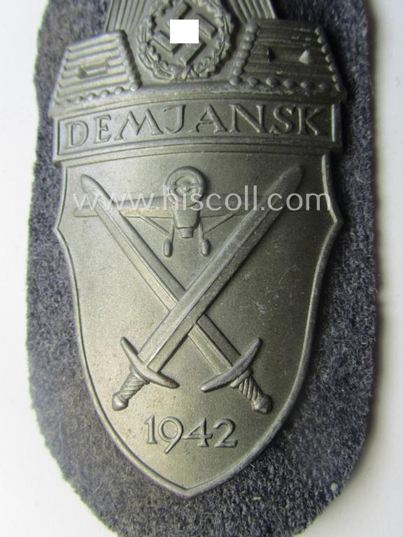 This is a truly very attractive - and/or very detailed! - example of the (actually nowadays scarcely encountered!) WH (Luftwaffe) so-called: 'Demjansk'-campaign-shield and that comes in an overall very nice- (I deem issued- albeit simply never worn- nor once tunic-attached- ie. still 'virtually mint'-), condition. The (typical magnetic and minimally converse-shaped) campaign-shield - which is executed in greyish-silver-coloured metal (ie.: 'Eisenblech') - comes naturally complete with its metal-based back-plate and retains all four of its originally attached pins ie. prongs in place: moreover, does it still retains its (thin-shaped, blue-toned) backing-paper in place (as can be seen on the pictures). The shield - that comes mounted onto its piece of typical bluish-grey-woolen-based Lufwaffe cloth - shows some minimal aging caused by storage only: some minimal staining is visible and/or present but it still retains very nice detail as to be expected: moreover, is all of its protective lacquered finish nicely preserved. The shield was found at a private-household in Germany and was simply stored as such for decades: it was never before in a collection. It should furthermore be mentioned that these 'Demjansk'-campaign-shields are nowadays hard to come by: even more so when they are of the Luftwaffe-type. Simply a very nice - and naturally original! - example of this collectable and desirable campaign-shield that nowadays is not that often offered for sale: simply the nicest such example I ever had on offer!