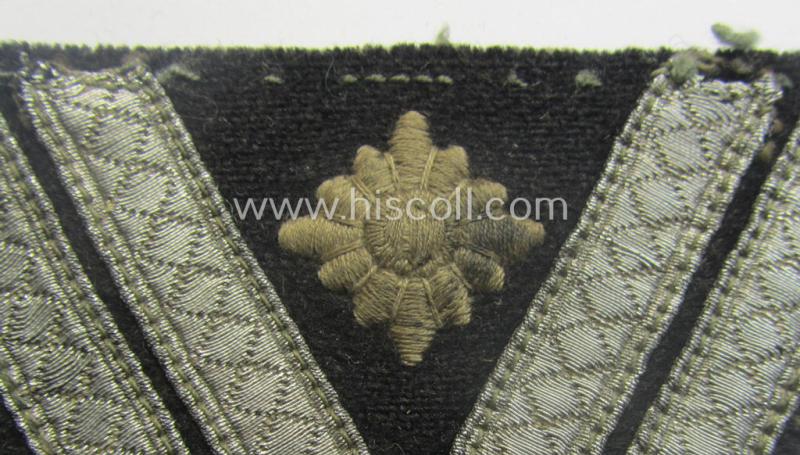 This is an attractive - and truly rarely found! - example of a WH (Heeres) Panzer-related-'Armwinkel' (ie. rank-chevron) as specifically intended for usage on the black-coloured 'Panzer'-type 'wrap-around'-tunics as was executed on a typical black-coloured- and/or woolen-based background as was intended for usage by a soldier with the - very unusually encountered! - rank of: 'Stabsgefreiter' (ie. senior-private) and that comes in an overall very nice- (and I deem issued and/or clearly worn and/or carefully tunic-removed-), condition. The chevron is neatly executed and shows a detailed, machine-embroidered- (and silverish-white-coloured) 'star' whereunder a double-stripe of silverish-coloured- and/or 'standard'-pattern NCO-braid can be observed. The piece is additionally 'backed' with a piece of bluish-grey-coloured linnen (as can be seen on the pictures). The black-coloured piece was most certainly intended for army (ie. Heeres) usage and could not be used by an SS-staffmember simply due to the fact that this particular rank did NOT exist within the (Waffen) SS. Simply a very attractive WH 'Panzer'-type rank-badge that is I deem priced according to its unmistaken rarity!