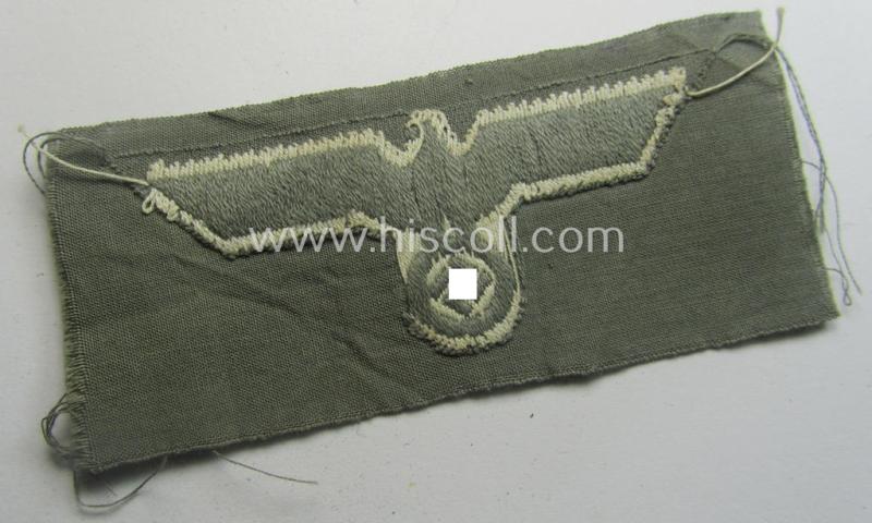 This is an attractive example of a WH (Heeres) - very early- ie. pre-war-period! - white-coloured side-cap-eagle (ie. 'Schiffchenadler für Mannschaften u. Unteroffiziere des Heeres') as was executed in the neat 'BeVo'-weave pattern on a typical greyish- (ie. bluish-green-) coloured background and that comes in an overall very nice- (ie. never used- nor worn ie. 'virtually mint ie. unissued'-), condition. The eagle is executed in white-coloured linnen on a greyish- (ie. bluish-green-) coloured (and also linnen-based-) background and saw usage directly after the 'Reichswehr'-period (I deem around in the years 1935/36). It should be noted that especially these early-type side-cap-eagles are nowadays not that easily encountered: something that merits my asking-price. The piece on offer here comes in an overall very nice- (ie. never confectioned- nor side-cap-attached-) condition and comes as 'straightly cut-of the role' (as can be seen on the pictures). The piece - which is executed in the so-called: 'BeVo'-weave-pattern as to be expected - shows some minimal storage-age ie. staining simply caused by decades of storage only and can naturally easily serve to restore any early-pattern 'Heeres Schiffchen'. Simply a nice occasion to acquire an early-pattern WH side-cap-eagle for a competitive price!