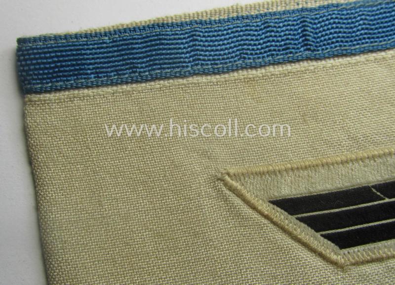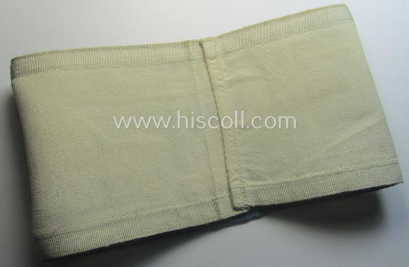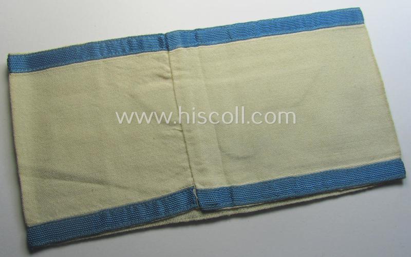 This is a truly attractive - and with certainty rarely encountered! - WH (Heeres ie. Kriegsmarine) armband (or: 'Dienst-Armbinde') as was (presumably) intended for (graduated) staff-members serving within one of the army- (ie. naval-) officers' cadet-schools and that comes in overall very nice- (ie. minimally used- and/or worn-) condition. The neat armband - which measures 39 x 10,5 cms. - shows the typical WH eagle-device as woven in black-coloured(!) linnen onto a white-(ie. somewhat beige-coloured and/or minimally stained) linnen-based background. The eagle - which is period attached to the armband by means of period machine-stitching - is neatly executed in 'BeVo'-weave pattern and is only the third such rare example I have ever encountered. The piece - which has clearly been used and worn and shows some obvious wear, age and/or staining - has furthermore the (typical-) light-blue coloured borders but is not 'enclosed' within a frame of similar braid. (Note: It might therefore have been intended for usage by cadets ie. junior-officers who did not yet fully completed their training). This example originates from a larger-sized cloth-insignia-collection that was compiled over the years and that I recently acquired for the web-site. Simply a very attractive - and with certainty rarely seen! - Heeres- (ie. eventually Kriegsmarine-) related 'Armbinde' which is I deem priced according to its desirability and/or unmistaken rarity!