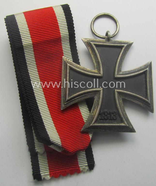The attractive - and with certainty desirable and not that often encountered! - 'Eisernes Kreuz II. Klasse' (or: iron cross 2nd class) was most certainly issued but hardly worn: it came together with its pre-folded- and minimally-confectioned, somewhat orange-red-coloured (and approx. 29 cms. long-sized-) ribbon (ie. 'Bandabschnitt'). The neat cross - which is void of any makers'-signification as is more often encountered - has never been cleaned nor polished and has a nice and attractive somewhat 'darkened' age-patina (the piece has, however, lost most of its so-called: 'hochpolierte Kanten' (or: polished sides) as can be seen on the pictures. The cross shows, however, a fully preserved, black-finished- (ie. somewhat satin-like- ie. matted) core: no real damage whatsoever is visible on the black core: just some dirt- ie. dust is visible and/or present. The cross has very nice and/or pronounced detail. The differences between a 'runder Drei'- (ie. rounded-three-) pattern and a regular type IC can easily be spotted when compared next to a regular format IC: the '3'-numeral in both year-designations '1939' and/or '1813' is clearly 'rounded' in style and execution (as can be seen on the pictures). The cross is magnetic as to be expected and came as stated above with its used ribbon (ie. 'Bandabschnitt') as found and stored for decades. It should be noted that these 'runder Drei'- (ie. rounded-three-) pattern ICs can easily be graded 'truly scarce'. Simply a great example that comes in an overall nice condition!