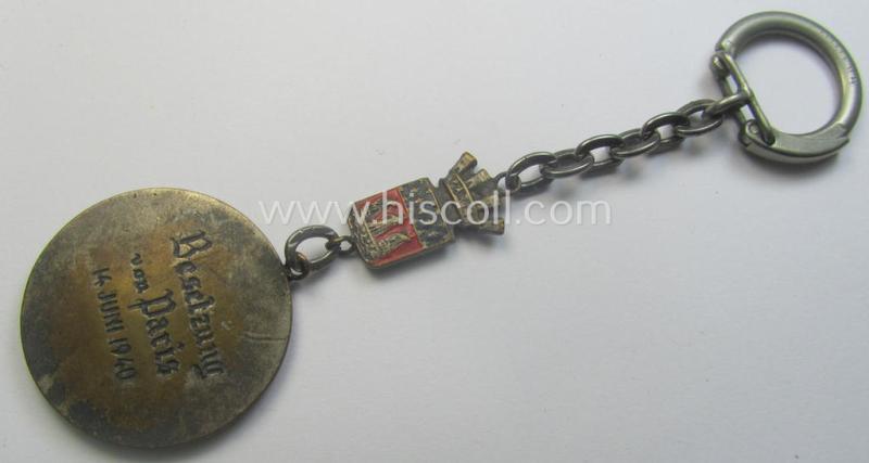 Commemorative, French-produced(!), silver-toned 'souvenir-plaque' ie. key-holder (ie. 'Erinnerungs- o. Auszeichnungsplakette') showing an illustration of the 'Eiffel Tower' in Paris and text: 'Besetzung von Paris - 14 Juni 1940'