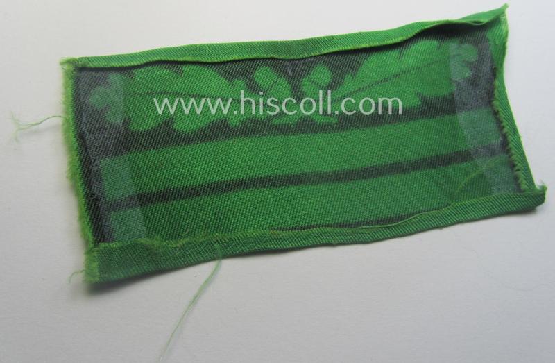 This is an attractive - (I deem) clearly used- and/or carefully tunic-removed albeit regrettably single! - officers'-pattern, WH (Heeres o. Waffen-SS) rank-insignia-bar (ie. 'Rangabzeichen für die Tarnuniform') as was intended for usage on the various camouflaged-uniforms by a junior-ranked officer holding the rank of: 'Oberleutnant' (ie.: 'SS-Obersturmführer') being a typical, printed example as executed on typical silk-like material (ie. 'Kunstseide') and that comes in an overall very nice- (ie. I deem cleary used- ie. worn-), condition. The piece - which is of the 'printed pattern' as executed in black on a bright-green-coloured and/or 'silk-like'-type, linnen-based background - shows a single oakleaf-bar and two square-sized rank-bars signifying that it was intended for usage by a junior-officer with the rank of: 'Oberleutnant' (ie.: 'SS-Obersturmführer'). The piece is just a tiny bit stained caused by moderate wear and/or decades of storage but is simply nicely preserved over the years (as can be seen on the pictures). Simply an attractive - and actually not that often encountered! - truly used. WH (Heeres o. Waffen-SS) rank-insignia-bar that is with certainty accordingly priced: too bad that it is only a single specimen!