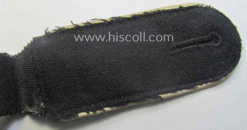 This attractive - and I deem just moderately worn, albeit regrettably single! - Waffen-SS, enlisted-mens'-type shoulderstrap shows the neat white- (ie. 'weisser'-) coloured branchcolour and/or typical woolen-type piping attached and was as such worn by an SS-member holding the rank of: 'SS-Mann der Infanterie-Truppen' (or: simple soldier who served within the SS-infantry-troops). The strap is in all facets a fully 'text-book'- (and I deem mid- war- ie. somewhat later-period!) SS-strap and does show the minimal signs of having been used and/or worn as such. The shoulderstrap - that measures approx. 10,8 cms. sized in length as more often encountered - shows some moderate age simply caused by moderate wear and/or usage. The strap comes with its (typical) smaller-sized tongue attached and does show a black-coloured 'underlay' that is constructed from wool (as can be noticed on the pictures). It should be noted that these original, period Waffen-SS, EM-type shoulderstraps can nowadays easily be graded 'scarce': even more so when they are piped in the not that commonly encountered, white-coloured- (ie. 'SS-Infanterie-Truppen'-related-) branchcolour. I deem that this attractive Waffen-SS, EM-type shoulderstrap is accordingly priced!