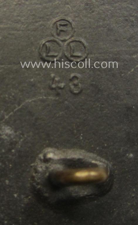 WH (KM) 'Marine-Artillerie-Abzeichen' being a maker- (ie. 'F.L.L. - 43'-) marked- and/or zinc- (ie. 'Feinzink'-) based example by the: 'Friedrich Linden'-company