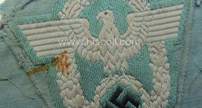 This is an attractive - clearly used- and/or most certainly tunic-removed! - example of a Police- (ie. 'Polizei'-) related armbadge (ie. arm-eagle) being a typical 'BeVo'-woven example that comes mounted onto a field-grey-coloured background and that comes in a just moderately used- (ie. carefully tunic-removed-), condition. The - fairly large-sized arm-badge (which measures approximately 8 x 8,5 cms. - is executed on the typical 'Polizei'-type linnen-based cloth and is an excellent example of the employed 'BeVo-weave'-technique. The piece - that shows clear age, wear and/or staining - still shows some of its period stitching-holes and/or remains (as can be seen on the pictures). Of additional interest is furthermore the fact that these arm-eagles saw also usage on the Waffen-SS-pattern, camouflaged 'Dot'-pattern 'Polizei'-tunics. Simply a very nice example that is accordingly priced!