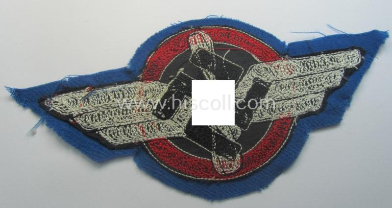 This is an attractive - and actually truly rarely seen! - HJ (ie. 'Hitlerjugend') pre-war- (ie. after 1938-) so-called: 'Sporthemdabzeichen' (ie. sports'-shirt-badge) that was intended for usage by a member who served within the so-called: 'Luftsportscharen' being an example that comes in an overall nice- (ie. clearly issued- and/or I deem once tunic- ie. shirt-attached-), condition. The neat patch - which is nicely machine-stitched in multi-coloured, so-called: 'Kurbelstickerei' - depicts a pair of white-coloured- and stylised wings and propellor, overlaid with a white-edged, black-coloured swastika as set on a red circle, all on a typical blue-coloured background. The badge is fairly large-sized and measures from wingtip to wingtip approximately 17 cms. Although the 'Luftsportscharen' (or: air-sports squad) was set-up under the auspices of the DLV (or: 'Deutches Luftsport Verband') it became generally known as: 'Flieger-HJ'. This example shows minimal age, wear and/or staining but is totally void of any damage. Simply an attractive and rarely seen youth-related sports'-shirt-patch that does not come often for sale: I deem that I have priced this very attractive example accordingly!