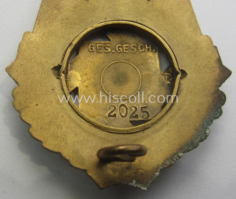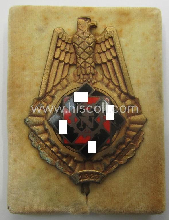 This is a truly superb - and actually rarely encountered! - so-called: 'Technische Nothilfe' (ie. 'TeNo') honorary-award (ie. 'Ehrenzeichen mit Jahreszahl 1923') being a maker- (ie. 'Wilh. Fühner'-) marked and/or: serial-numbered (ie. '2025'-marked-) example that comes stored in its accompanying etui-inlay as issued and/or stored for decades. The very attractive and neatly multi-coloured award (that is executed in golden-bronze-toned so-called: 'Buntmetall') has a fully preserved enamelled surface (that is totally void of any enamel-damage or alike as can be seen on the pictures). It comes mounted on its functonal (and totally unaltered!) pin- ie. pin-/catch set-up. The pin shows a clearly present makers'-mark that reads: 'Wilhelm Fühner - Pforzheim' (being the only producer of these rarely observed awards). The back of the badge shows an engraved serial- ie. bearers'-number (that reads: '2025'). The award came stored in its period (beige-coloured- and carton- ie. velvet-based-) etui-inlay (ie. interior-section) that shows some evident usage. The accompanying etui is regrettably missing. Simply in all respects a very attractive TeNo-award-set. It should, moreover, be noted that I have seen these rarely seen: 'Ehrenzeichen mit Jahreszahl 1923'-sets sell for much more than my asking-price!