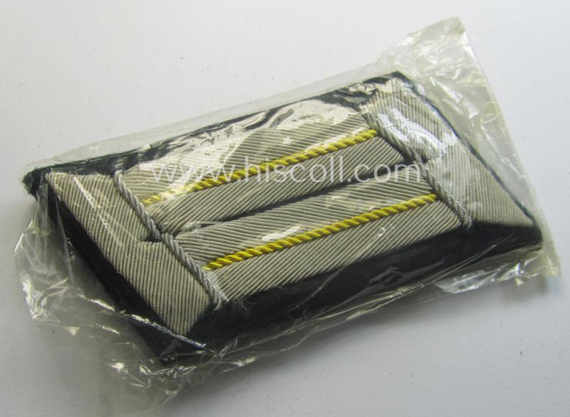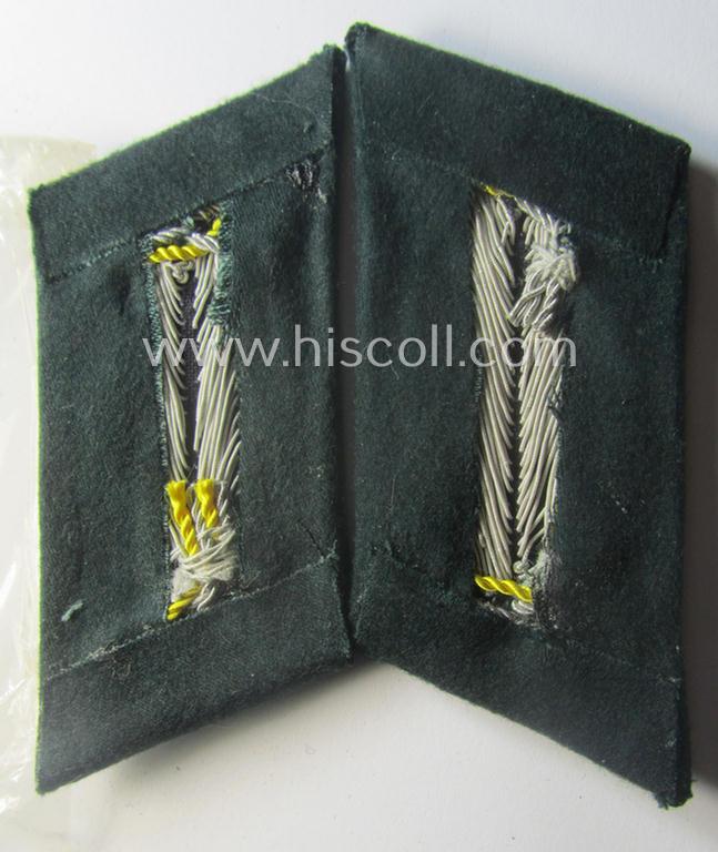This is a truly very attractive - fully matching and with certainty not that easily found! - pair of 'standard-issue'-pattern', neatly hand-embroidered officers'-type collar-tabs (ie. 'Kragenspiegel für Offiziere') as was piped in the desirable bright-yellow- (ie. 'zitronengelber'-) coloured branchcolour as was specifically intended for usage by an: 'Offizier der Nachrichten-Truppen' (or: officer who served within an army signals-unit) and that comes in an overall very nice- (ie. simply never used- nor tunic-attached- ie. 'still virtually mint'-), condition. The bright-yellow-piped pair - which is as more often void of an additional 'backing' - is neatly hand-embroidered in silverish-coloured 'braid' and that came still packed in (most of) its (period) 'Cellophan'-pouch as issued (as can be seen on the pictures). The pair was simply never worn nor tunic-attached: it shows some truly minimal storage-age only (as can be seen on the pictures). The pair originates from a private-household in Germany. Simply an attractive collar-tab-pair that was intended for an: 'Offizier der Nachrichten-Truppen' and that will be impossible to be upgraded!