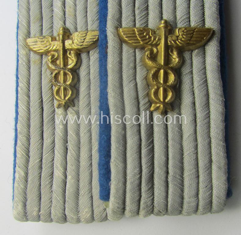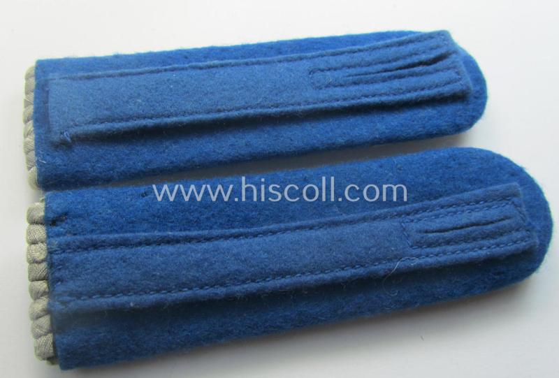 This is an attractive - later-war-period and fully matching! - pair of specific 'cyphered', officers-type shoulderboards (ie. 'Schulterstücke für Offiziere') as was intended for an administratve- (ie. 'Verwaltungs'-related-) officer ie.: 'Leutnant des TSD o. Truppensonderdienst' (being of a rank comparable with a: lieutnant-rank) and that comes in an overall very nice- (possibly issued- albeit still 'virtually mint'-), condition. The boards - which have an approximate length of 10,6 cms. - are executed in the 'smooth'-like- and/or (typical) bright-blue- (ie. 'hellblauer'-) coloured wool (aka 'moleskin'-wool) as was specifically intended for later-war-period administrative- (ie. 'Verwaltung'-) officials. The boards - which were worn on the 'standard'-type, field-grey-coloured 'Heeres'-tunics - have a neat set of (identical, zinc-based- and/or bright-golden-toned) so-called: 'Merkurstab'-cyphers (ie. 'Ziffern') period-attached denoting the junior officers'-rank of: 'Leutnant'. The shoulderboard-pair came mounted onto its function (smaller-sized) tongues attached (as can be seen on the pictures). The pair was simply never used and just shows some storage-age only. This scarcely seen (later-war-period) 'TSD'-related shoulderboard-pair (which was instituted as late as April 1944) was recently found at a private-household in Germany. Simply an attractive - and actually not that easily encountered! - set of officers'-pattern shoulderboards that belonged to a: Heeres-related 'Leutnant des TSD o. Truppensonderdienst'!