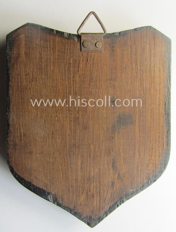 This is an attractive - and with certainty not that often encountered! - golden-bronze-toned- and typical shield-shaped so-called: 'nichttragbarer Ehrenpreis' (ie. commemorative-plaque) showing a detailed: 'Reichskriegsfahne' and 'Reichsadler'-device coupled with the (period-engraved) text that simply reads: 'Crewsportfest 1939 - Gruppenzehnkampf - 2. Preis' and that comes as issued and/or stored for decades. The neat - medium-sized and/or regular-weight - piece measures approximately 7 x 6,5 cms. and has pronounced detail as to be expected. It shows a detailed illustration of both a: 'Reichskriegsfahne' and 'Reichsadler'-device and shows the (partly engraved) text as mentioned above. The piece was never cleaned nor polished and has maintained a neat (somewhat frosted- and/or minimally tarnished) golden-bronze-toned age-patina (as can be seen on the pictures). The piece - which is totally void of a makers'-designation - originates from a private-household in Germany where it was recently uncovered as issued and stored for decades (as can be seen on the pictures). The piece comes period-mounted onto a darker-toned, wooden plaque as issued. Simply an attractive sports- (ie. sailing-) related naval award-plaque ie. 'Erinnerungs- o. nichttragbare Ehrenpreis' that is I deem accordingly priced!