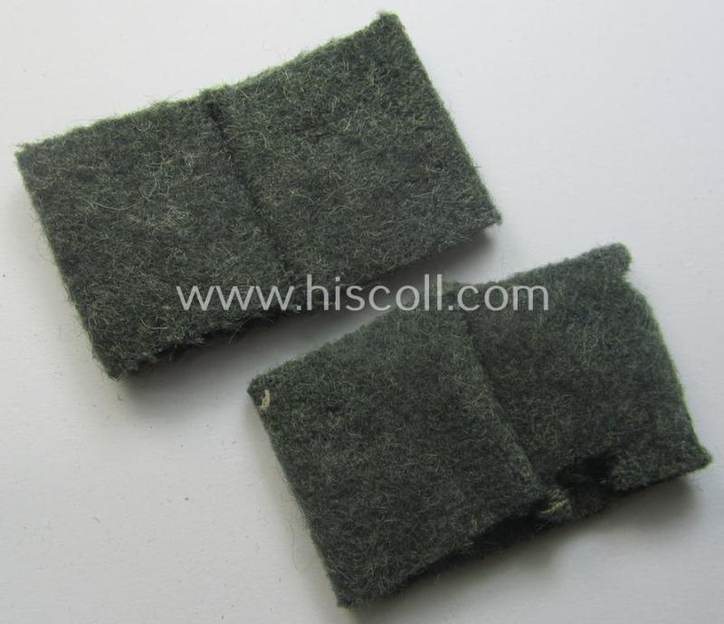 This is an attractive - fully matching and scarcely found! - pair of WH (Heeres) 'Grenadiere'-related, so-called: regimental shoulderstrap-'slip-ons' (ie. 'Schulterstück-Überschuben') as was intended for usage by a: 'Soldat des Grenadier-Regiments 115' and that comes in a wonderful- (and I deem simply never worn- nor used-), condition.The pair is neatly 'machine-stitched'-embroidered (by means of so-called: 'Kurbelstickerei') in the typical bright-green- (ie. 'hell- o. wiesengrüner'-) coloured wool and does show some minimal storage-age only. Simply an attractive pair of 'Grenadiere'-related- (ie. later-war infantry-) related 'Überschuben' that is - I deem - accordingly priced: great to 'decorate' a pair of 'hellgrüner'-piped 'Heeres'-shoulderstraps or ideally fitted to keep in any insignia-collection!