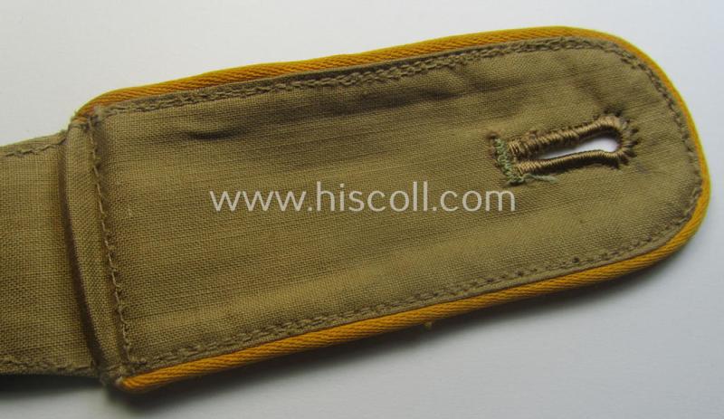 This is an attractive - albeit regrettably single! - WH (Luftwaffe) tropical-issued, enlisted-mens'-type-shoulderstrap as executed in beige- (ie. tan-) coloured linnen (as was specifically intended for usage on the tropical-shirts ie. tunics) as was intended for a: 'Soldat der Flieger- o. Fallschirmjäger-Truppen' (or: simple soldier who served as a pilot or paratrooper) and that comes in a most certainly issued- albeit hardly used-, condition. The neat shoulderstrap - which is approximately 11 cms. sized in length - shows the neat golden-yellow- (ie. 'goldgelbener'-) coloured branchcolour (ie. 'silk-like'-type piping) attached. It is executed in the regular - albeit slightly 'thicker'-styled linnen - and comes naturally mounted onto its functional tongue (as can be seen on the pictures). It should be noted that these LW tropical-styled, EM-type shoulderstraps can easily be considered 'fairly scarce': even more so when they come in such a neat and/or hardly used- ie. worn, condition!