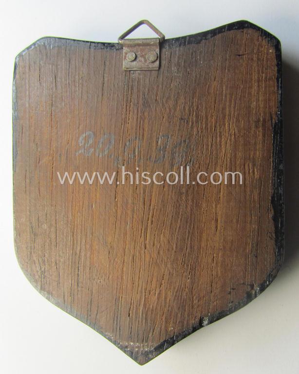 This is an attractive - and with certainty not that often encountered! - golden-bronze-toned- and typical shield-shaped so-called: 'nichttragbarer Ehrenpreis' (ie. commemorative-plaque) showing a detailed: 'Reichskriegsfahne' and 'Reichsadler'-device coupled with the (partly period-engraved) text that simply reads: 'Standort-Segel-Wettfahrten - III. Preis - Mürwick - 28.St.S.W. - 20.9.39' and that comes as issued and/or stored for decades. The neat - medium-sized and/or regular-weight - piece measures approximately 7 x 6,5 cms. and has pronounced detail as to be expected. It shows a detailed illustration of both a: 'Reichskriegsfahne' and 'Reichsadler'-device and shows the (partly engraved) text as mentioned above. The piece was never cleaned nor polished and has maintained a neat (somewhat frosted- and/or minimally tarnished) golden-bronze-toned age-patina (as can be seen on the pictures). The piece - which is totally void of a makers'-designation - originates from a private-household in Germany where it was recently uncovered as issued and stored for decades (as can be seen on the pictures). The piece comes period-mounted onto a darker-toned, wooden plaque as issued. The piece shows a pencilled date on its back that reads: '20.9.39' (as can be noticed on the pictures). Simply an attractive sports- (ie. sailing-) related naval award-plaque ie. 'Erinnerungs- o. nichttragbare Ehrenpreis' that is I deem accordingly priced!