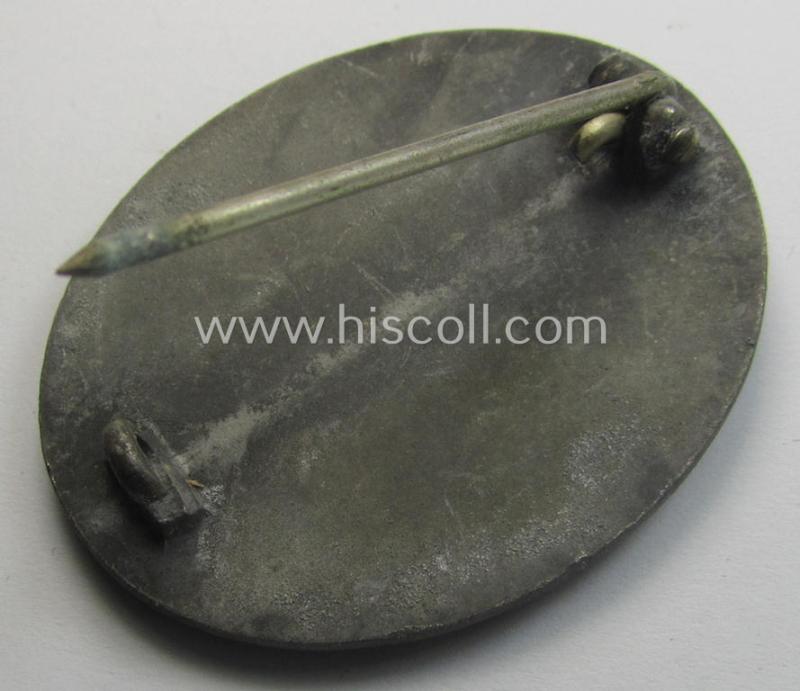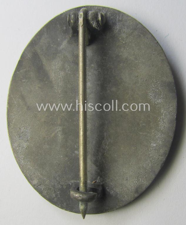 The neat - and typical zinc- (ie. 'Feinzink'-) based - silver-class wound-badge (or: 'Verwundeten-Abzeichen in Silber') shows only moderate age and wear and still retains a bit of a original, silverish-grey-coloured- (ie. zinc-like-) finish: it just shows some minimal wear and/or age (as can be seen on the pictures). The badge is as stated above a non-maker-marked example (as can be seen on the pictures). Of course, are the (regular- ie. thin-shaped-) pin and/or (typical molded) catch (-set-up) fully functional and of course present. This piece has never been cleaned nor polished: it shows some minimal age, dust and/or staining as to be expected. Simply a nicely preserved and just moderately worn example that is I deem with certainty accordingly priced!