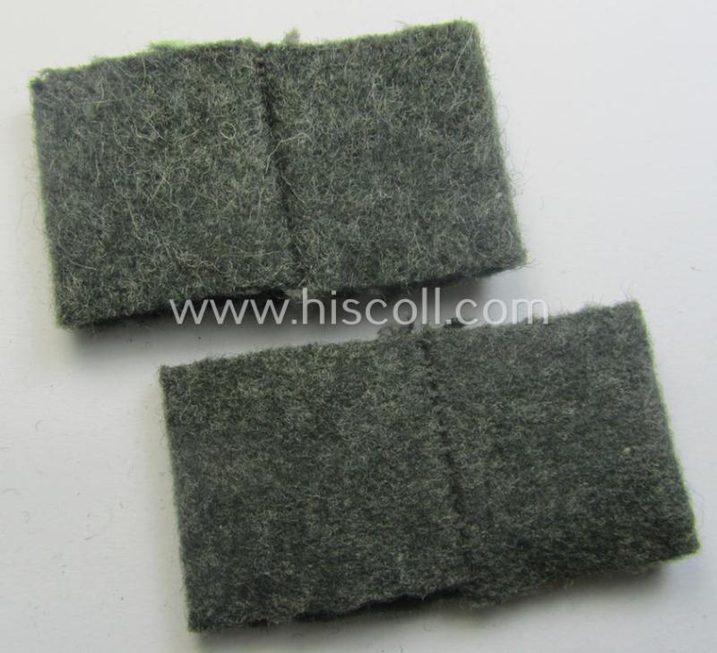 This is an attractive - fully matching and scarcely found! - pair of WH (Heeres) 'Grenadiere'-related, so-called: regimental shoulderstrap-'slip-ons' (ie. 'Schulterstück-Überschuben') as was intended for usage by a: 'Soldat des Grenadier-Regiments 115' and that comes in a wonderful- (and I deem simply never worn- nor used-), condition.The pair is neatly 'machine-stitched'-embroidered (by means of so-called: 'Kurbelstickerei') in the typical bright-green- (ie. 'hell- o. wiesengrüner'-) coloured wool and does show some minimal storage-age only. Simply an attractive pair of 'Grenadiere'-related- (ie. later-war infantry-) related 'Überschuben' that is - I deem - accordingly priced: great to 'decorate' a pair of 'hellgrüner'-piped 'Heeres'-shoulderstraps or ideally fitted to keep in any insignia-collection!