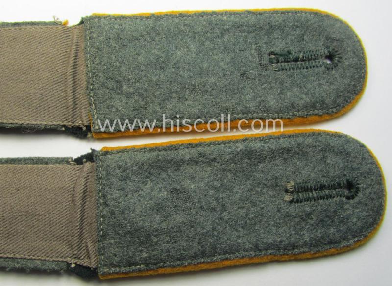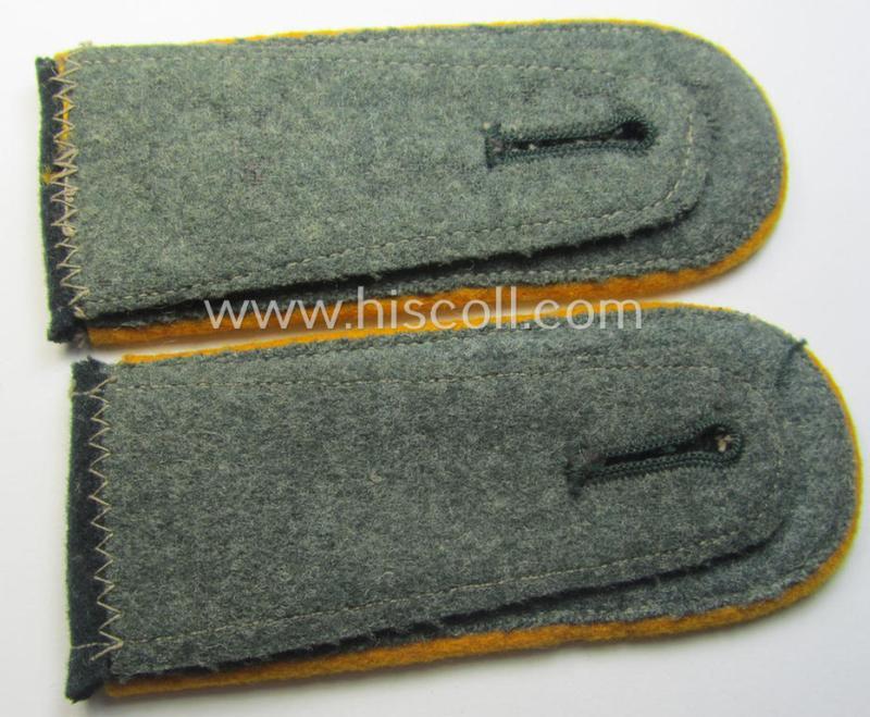 This is an attractive - fully matching and (I deem) pre-war- ie. evt. early-war-period! - pair of 'standard-issued'-pattern, WH (Heeres) early- ie. pre-war period- (ie. 'M36'- ie. 'M40'-pattern and/or: rounded-styled), neatly 'cyphered' enlisted-mens'-type shoulderstraps (ie. 'Schulterstücke für Unteroffiziere des Heeres') as was piped in the desirable golden-yellow- (ie. 'goldgelbener'-) coloured branchcolour as was specifically intended for usage by a: 'Soldat des Kavallerie- o. Reiter-Regiments 15' (or: simple soldier who served within the cavalry regiment, numbered: '15') and that comes in an overall very nice- (ie. I deem just moderately used- ie. worn-), condition. The neat straps - which have the 'standard'-pattern, darker-green-coloured and/or typical 'smooth woolen'-based 'upperdecks' and that measure approximately 11,2 cms. in length each - show the neat golden-yellow- (ie. 'goldgelbener'-) coloured and/or (typical) woolen-type piping attached (as can be seen on the pictures). The pair comes naturally mounted onto their period-attached- (regular-shaped) tongues attached and comes in a very nice- (ie. fully 'text-book') condition overall (as can be seen on the pictures). The pair shows the neat (machine-embroidered by means of so-called: 'Kurbelstickerei') so-called: '1'- and/or: '5'-cyphers ie. numerals (or: 'Ziffern'). Both 'cyphers' are executed in the golden-yellow- (ie. 'goldgelbener'-) coloured wool ie. linnen as to be expected (as can be seen on the pictures). These type of shoulderstraps are of the fairly early-war-period pattern straps and were worn in the period around 1939/1940 (and were 'worn-out' even during the rest of the war). The pair only shows moderate wear and/or age and is just nicely preserved over the years (as can be seen on the pictures). I deem this an excellent occasion to acquire a neat - and most certainly desirable! - EM-type, 'Kavallerie'-related, Heeres-EM-type shoulderstrap-pair for a justified price!