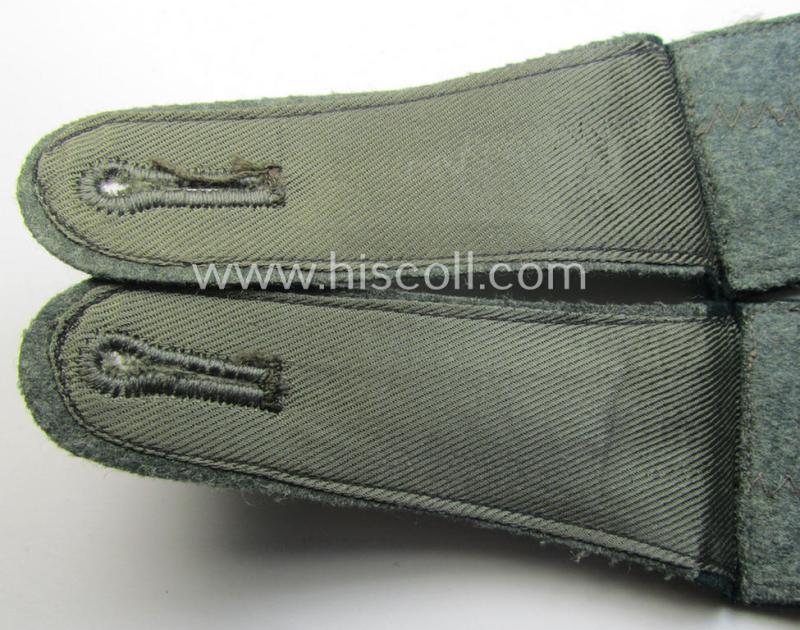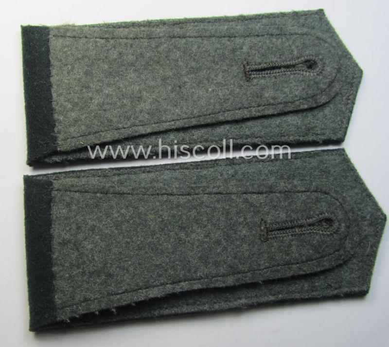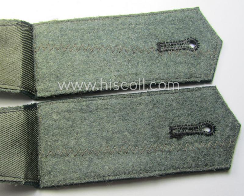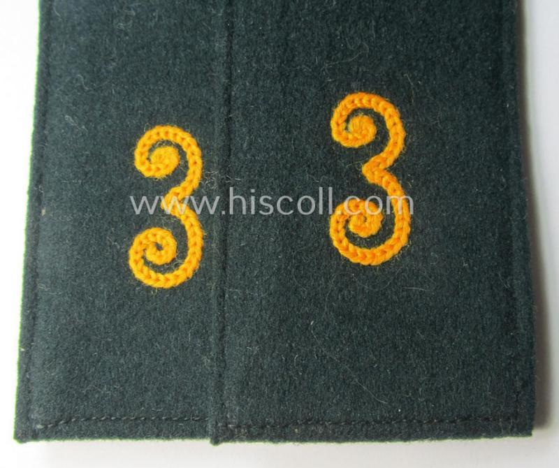 This is a truly attractive - fully matching and actually scarcely found! - pair of WH (Heeres), early- (ie. pre-) war-period, 'M36'-pattern (pointed-styled), 'cyphered' enlisted-mens'-type shoulderstraps (being a pair having no branchcolour ie. piping as per regulation) as was intended for usage by a: 'Soldat des Kavallerie- o. Reiter-Regiments 3' (or: simple soldier who served within the cavalry regiment, numbered: '3') and that comes in overall very nice- (albeit minimally used- and/or worn-), condition. The neat straps - which are both approximately 11cms. sized in length - have the 'standard-pattern' and/or: darker-green-coloured- (and woolen-based) 'upperdecks' and have as stated above no piping nor branchcolour attached: they are of the 'generic pattern' (as can be seen on the pictures). The shoulderstraps show the neat, golden-yellow- (ie. 'goldgelbener'-) coloured and/or machine-embroidered: '3'-numerals ie. 'Ziffern' (which are executed in so-called: 'Kurbelstickerei' as to be expected). The pair comes naturally mounted onto its original tongues and does just show some minimal age-, wear and/or staining (as can be seen on the pictures). Simply a neat - and I deem quite early- (ie. pre- or early-war-) period - 'Heeres' EM-type, shoulderstrap-pair that belonged to a: 'Soldat des Kavallerie- o. Reiter-Regiments 3': I deem that I have priced this attractive - and surely desirable! - Heeres-pair, accordingly!