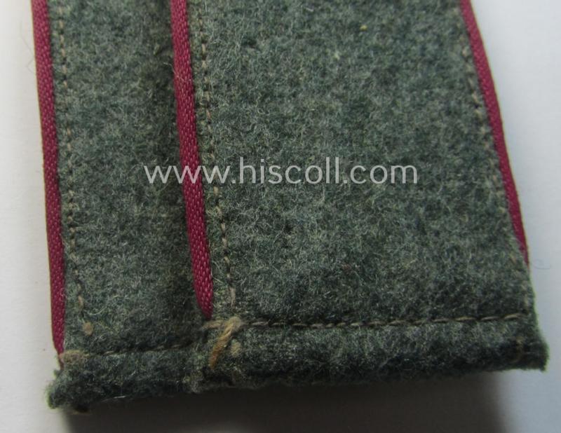 The truly very attractive - fully 'text-book' and in all respects matching! - pair of 'standard-issued'- (ie. clearly 'non-privately-purchased'!) pattern, WH (Heeres) enlisted-mens'-type shoulderstraps is piped in the desirable, neat darker-purple-red- (ie. 'bordeaux-roter'-) coloured branchcolour and measures approximately 11,2 cms. in length each. The straps have the desirable darker-purple-red- (ie. 'bordeaux-roter'-) coloured- and/or: 'silk-like'-type piping attached (as is more often encountered with these early- ie. mid-war-period shoulderstrap-pairs) and was as such intended for usage by a: 'Soldat eines (Nebel)Werfer-Regiments o. Abteilungs' (or: simple soldier who served within an army smoke-troops unit ie. regiment). The shoulderstraps are typical 'standard-issued'-examples that have the field-grey-coloured- and/or woolen-based 'upperdecks': they were - I deem - just minimally used ie. worn and do show some truly minimal wear, age and/or staining (as can be seen on the pictures). The straps come naturally mounted onto their functional tongues. These desirable 'M40- o. 43'-pattern, army 'Nebelwerfer'-related EM-type shoulderstraps as piped in the darker-purple-red- (ie. 'bordeaux-roter'-) coloured branchcolour can nowadays easily be graded 'rare'. Simply a very attractive - and fully matching! - shoulderstrap-pair that belonged a: 'Soldat eines (Nebel)Werfer-Regiments o. Abteilungs' and that is priced according to its unmistaken rarity and/or desirability!
