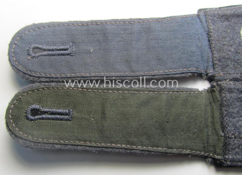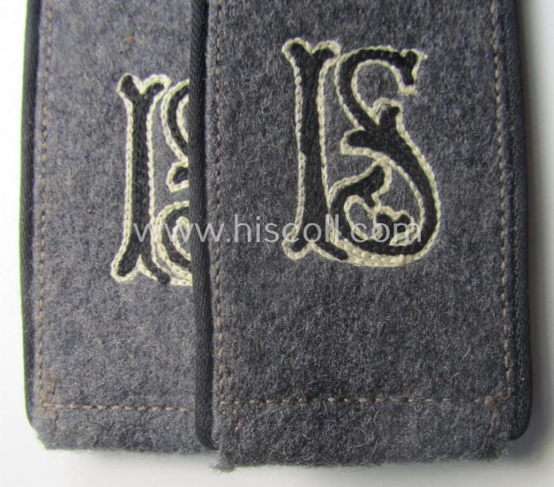 This is a truly very attractive - and/or fully matching! - pair of of neatly 'cyphered', WH (Luftwaffe), enlisted-mens'-type shoulderstraps as piped in the neat black- (ie. 'schwarzer'-) coloured branchcolour as was specifically intended for usage by a: 'Soldat eines Luftschütz-Abteilungs (mot)' (or: simple soldier who served within a motorised, LW-related air-raid-warden-service) and that comes in an overall very nice (ie. I deem simply never used- ie. still 'virtually mint'-), condition. The neat shoulderstraps - which measure approximately 11,5 cms. in length each and that come naturally mounted onto their functional tongues - are as stated above piped in the neat black- (ie. 'schwarzer'-) coloured branchcolour and have the desirable 'silk-like'-type piping attached (as can be seen on the pictures). They show the black-coloured- (and white-rimmed) so-called: 'LS'-cyphers ie. 'Ziffern' (which are executed in so-called: 'Kurbelstickerei' as to be expected). The straps were - I deem - simply never used nor worn and do show some minimal storage-age ie. staining and are totally void of any damage or alike. Simply a great occasion to acquire an attractive - and with certainty scarcely seen! - EM-type, LW-shoulderstrap-pair that was specifically intended for a: 'Soldat eines Luftschütz-Abteilungs (mot)'!