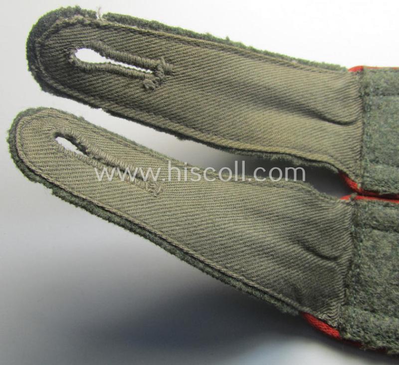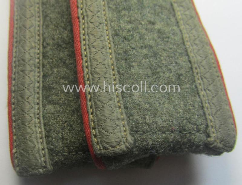 This is a truly very attractive - I deem just minimally used and/or fully matching! - pair of typical 'standard-issued'- (ie. non-'tailor-made'-) pattern, WH (Heeres) early- (ie. mid-) war period- (ie. 'M40'- ie. 'M43'-pattern) NCO-type shoulderstraps (ie. 'Schulterklappen für Unteroffiziere des Heeres') as was piped in the desirable bright-red- (ie. 'hochroter'-) coloured branchcolour as was specifically intended for usage by an: 'Unterwachtmeister o. Unteroffizier eines (Sturm)Artillerie-Abteilungs o. Regiments' (or: junior-sergeant who served within an artillery unit or regiment) and that comes in an overall very nice- (ie. I deem just minimally used- ie. worn-), condition. The neat straps - which have the 'standard'-pattern, field-grey-coloured and/or typical woolen-based 'upperdecks' and that measure approximately 10,5 cms. in length each - show the neat bright-red- (ie. 'hochroter'-) coloured and/or desirable 'silk-like'-type piping attached (as can be seen on the pictures). The straps - that show the typical bluish-grey-toned (ie. truly sub-dued) NCO-braid attached - come naturally mounted onto their period (regular-shaped) tongues attached and come both in a very nice- (ie. fully 'text-book') condition overall (as can be seen on the pictures). The pair only shows minimal wear and/or age and is just very nicely preserved (as can be seen on the pictures). I deem this an excellent occasion to acquire a neat NCO-type, non-privately-purchased '(Sturm)Artillerie'-related shoulderstrap-pair for a justified price!
