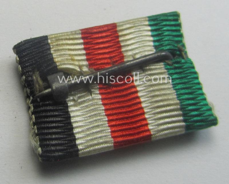 This is a neat - and I deem clearly used- and/or worn! - example of a single-pieced, WH (Heeres ie. KM etc.) medal-bar (ie. 'Feld- o. Bandspange') showing the colourful ribbon for a: 'Deutsch-Italienische Feldzugsmedaille' (or: German-Italian campaign-medal) and that comes as issued and/or recently found. The bar is of the of the larger- (ie. regular and/or: 2,5 cm. wide-) version and is naturally fully functional: it comes mounted onto its functional pin- ie. pin/catch set-up but is not 'backed' with a piece of wool (as can be noticed on the pictures). The piece does show some minimal age, wear and/or staining. Simply a neat - and actually not that easily encountered! - single-pieced 'Feld- o. Bandspange' as was intended for the: 'Deutsch-Italienische Feldzugsmedaille'!