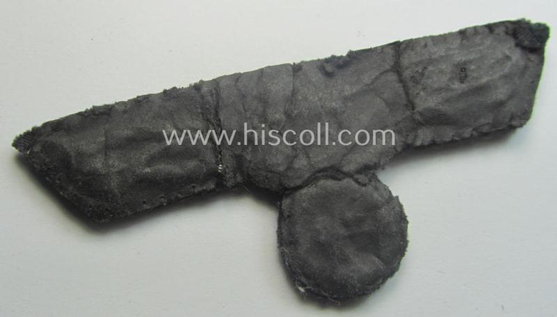 This is an attractive - and with certainty used and/or carefully tunic-removed! - example of a WH (Heeres) officers'-type, hand-embroidered- (and quite detailed!) army-type breast-eagle (ie. 'Brustadler für Offiziere des Heeres') being executed in bright-silverish-coloured braid on a darker-green-coloured- and/or 'smooth'-woolen-based background and that comes in an overall nice- (and as stated above carefully tunic-removed-), condition. This example - having a length ie. 'wingspan' of approximately 11 cms. - is nicely hand-embroidered using (bright) silverish-coloured 'braid' on a darker-green-coloured (and/or woolen-based-) background and does show some 'high-lighted'-areas as executed in darker-green- (ie. black-) coloured thread ie. braid (as can be seen on the pictures). The eagle - which is void of a makers'-designation - does show minimal usage and wear as can be noticed on the pictures: it shows a neat additional 'backing' made-out of black-toned paper: moreover, does it show some clear stitching-remains (as can be seen on the pictures). Simply an attractive example of a fairly luxuriously-styled, WH (Heeres) officers'-type breast-eagle that is I deem accordingly priced!
