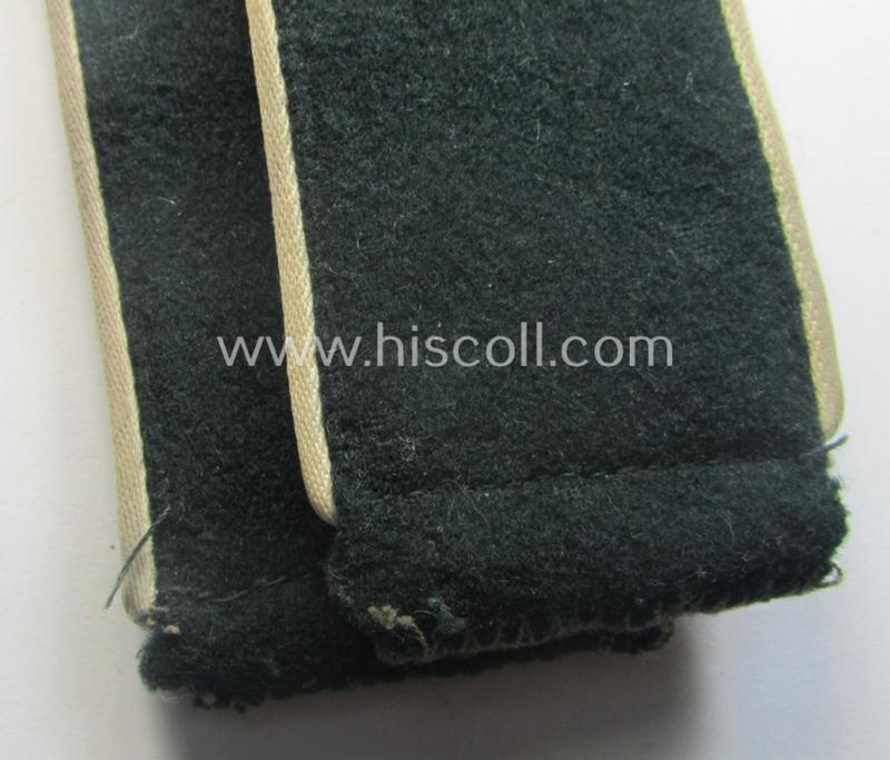 This is an attractive - fully matching and actually not that easily found! - pair of WH (Heeres), early- (ie. pre-) war-period (ie. 'M40'-pattern), 'standard-issued' (ie. NON-tailor-made!) enlisted-mens'-type shoulderstraps as piped in the neat white- (ie. 'weisser'-) coloured branchcolour as was intended for usage by a: 'Soldat der Infanterie-Truppen' (or: simple soldier who served within the infantry-troops) and that comes in overall nice- (albeit just moderately used- ie. worn-), condition. The neat straps - which are both approximately 12 cms. sized in length - have the 'standard-pattern', dark-green-coloured- and/or woolen-based 'upperdecks' and show the white- (ie. 'weisser'-) coloured- and/or desirable 'silk-like'-type piping attached (as can be seen on the pictures). The straps come naturally mounted onto their functional tongues and do both show some moderate age-, wear and/or minimal staining (as can be seen on the pictures). These type of shoulderstraps are of the fairly early-war-period pattern straps and were worn in the period around 1940 (and were 'worn-out' even during the rest of the war). This particular pair originated from a private-household in Germany and was most certainly always together and was worn as a pair. Simply a very attractive - and with certainty desirable! - 'Infanterie'-related EM-type shoulderstrap-pair: I deem that I priced this attractive pair according to its nice and fully untouched, condition!