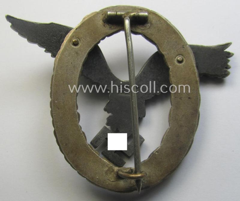 Early- (ie. pre-) war-period- and/or: 'Buntmetall'- (ie. 'Tombak'-) based: WH (Luftwaffe) 'Flugzeugführerabzeichen' (or: pilots-badge) being a clearly maker- (ie. 'C.E. Juncker'-) marked example of the 'J2'-pattern