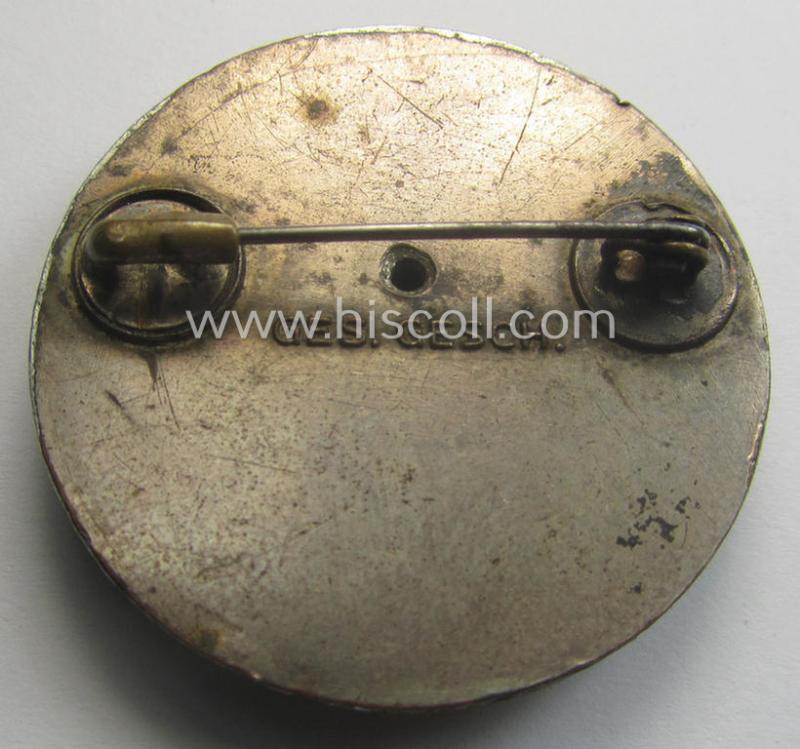 The attractive - clearly used but nevertheless very nicely preserved! - silvered 'Buntmetall'-based, so-called: DRK (ie. 'Deutsches Rotes Kreuz' or German Red Cross) nurses'-helpers ie. 'Schwesternhelferin'-badge is made out of (minimally darkened- ie. somewhat tarnished) silverish-grey-coloured- (and truly nicely enamelled!) 'Buntmetall' and has a truly immaculate enamelled surface (no damage can be noticed: just some obvious wear-marks are present and/or visible: moreover, is just a tiny bit dirty ie. stained). The badge is a non-maker-marked example that does show, however, a clear: 'Ges.Gesch.'-patent-pending-designation on its back (as can be seen on the photos). The badge is only moderately used and/or worn: it was never cleaned nor polished and comes of course mounted onto its functional pin- ie. pin/catch (-set-up). A similar example is also figured in the Heering-Hüsken lapel-pin-catalogue, wherein it is given the unique reference-number: '5613XB'. These attractive DRK-badges were also worn by the Germanic ie. European volunteers. Simply an attractive 'Buntmetall'-based example that will be hard to be upgraded and that is I deem accordingly priced!
