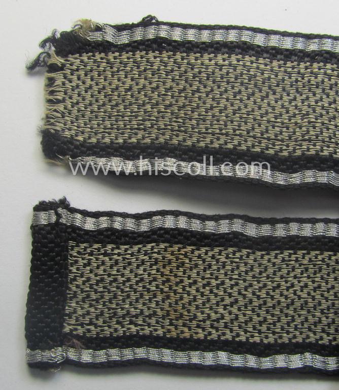 This is a very attractive - truly used- and/or carefully tunic-removed and naturally 100% original! - Waffen-SS-related, typical officers'-type, Waffen-SS 1939/1940-pattern cuff-title (ie. 'Ärmelstreifen für Führer der Waffen-SS') as executed in so-called: flat-wire 'BeVo'-weave-pattern (in typical Gothic-styled script) as was intended for an officer who served within the: SS-Regiment 'Der Führer' (part of the: 2. SS-Panzer-Division “Das Reich”) and that comes in an overall very nice- (ie. clearly issued- and/or once tunic-attached-), condition. The somewhat shortened cuff-title (that measures now approx. 40 cms. in length) has the typical 'officers-pattern-flatwire'-styled reverse-backing and shows all details of an original, period specimen. This band - that is void of an 'RzM'-etiket - was with almost certainty produced by the: 'Bandfabrik Ewald Vorsteher' (ie. 'BeVo') as was based in the town of Wuppertal. This cuff-title is a 100% text-book- (and as stated above) original example that originates from a US-veteran who 'liberated' this piece in 1945. The piece shows some truly minimal staining and/or storage age (and is somewhat 'wrinkled'): it was clearly used as such and was once stitched-together (as can be seen on the pictures). Simply a great opportunity to acquire a very attractive - and actually scarcely encountered! - Waffen-SS officers-pattern, flatwire 'BeVo'-type 'Der Führer'-cuff-title for a competitive price!