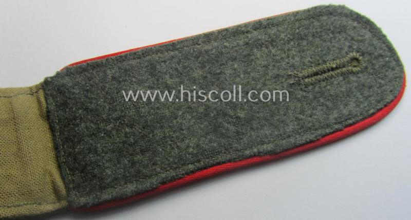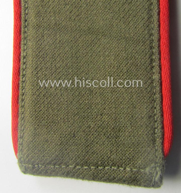 This is an attractive - albeit regrettably single but nevertheless fairly rarely encountered! - WH (Heeres) (I deem) somewhat later-war-pattern, 'tropical' (ie. truly DAK- or 'Deutsches Afrikakorps'-related) enlisted-mens'-type shoulderstrap as was piped in the neat bright-red- (ie. 'hochroter'-) coloured branchcolour as was intended for a: 'Soldat der Artillerie-Truppen' (or simple soldier who served within an army artillery-regiment) and that comes in an overall very nice- (I deem hardly used- nor worn-), condition. The neat shoulderstrap - which measures approximately 11,9 cms. in length - has the neat bright-red- (ie. 'hochroter'-) coloured and/or desirable 'silk-like'-type piping attached and comes mounted onto its functional tongue as issued and/or most certainly worn. The strap is in a fully 'text-book' condition and has a typical 'earthen-brown'- ie. mustard- coloured and/or linnen-based 'upperdeck'. The board is, moreover, 'backed' with field-grey-coloured wool, something that is more often encountered with genuine (somewhat later-war-pattern) tropical ie. DAK- (or 'Deutsches Afrikakorps'-) related shoulderstraps. The strap is I deem hardly worn and comes in a truly great condition overall. As most certainly known are most DAK-shoulderstraps offered on todays' market copies: this is naturally a fine and 100% genuine, period piece for which I give a life-time garuantee (as always). Simply a superb - and as most certainly known rarely encountered! - mid-war-pattern, tropical-pattern, 'Artillery'-related EM-type shoulderstrap: too bad that it is only a single piece!