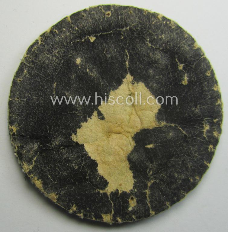 This is an attractive - albeit truly used- and/or worn but nevertheless very scarcely encountered! - WH (Heeres) neatly hand-embroidered, trade- and/or special-career insignia (ie. 'Tätigkeitsabzeichen') as was executed in golden-yellow-coloured (hand-embroidered and linnen-based) thread onto a darker-green-coloured background and that was specifically intended for usage by an army: 'geprüfter Wallmeister' (or: experienced fortification-construction NCO having at least one-years experience in this function) and that comes in an overall nice- (ie. I deem clearly used- and/or carefully tunic-removed-), condition. The patch is as stated neatly hand-embroidered in golden-yellow-coloured linnen onto a darker-green-coloured- and/or woolen-based background and shows an (additionally-added) silver-toned- and (somewhat thicker-styled ie. braid-based) hand-embroidered 'rim' attached as to be expected. The patch - that shows an additional, black-coloured and paper-based 'backing' attached - is totally void of a makers'-designation as more often (as can be seen on the pictures). Simply a very attractive - and actually scarcely encountered! - WH trade- and/or special-career patch (ie. 'Tätigkeitsabzeichen'): one of the more difficult to encounter examples of the extensive series!