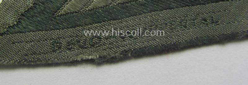 This is an attractive - and simply never used nor once tunic-attached! - example of a (typical later-war-period) WH (Heeres) so-called: 'M44'-pattern- (and/or trapezoid-shaped) breasteagle (ie. 'Brustadler für Mannschaften u. Unteroffiziere des Heeres') being a field-grey-coloured example that is executed in the neat 'BeVo'-weave pattern and that shows an interwoven 'BeVo-Wuppertal'-makers'-designation and that comes in an overall very nice- (ie. simply never used- ie. still 'virtually mint'-), condition. The piece - as executed in field-grey- ie. greyish-coloured linnen was the 'standard'-issue WH breasteagle as was used on most (later-war and/or battle-dress shaped) 'M-44-model-tunics. The eagle bears some truly minimal staining and/or wrinkled appearance (as can be seen on the pictures). Simply a very nice example: great to restore any M44 army-tunic or ideally fitted to be stored in any eagle- ie. cloth-collection!