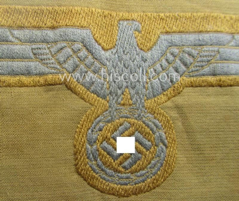 This attractive - and I deem somewhat early-period! - example on offer is neatly light-blue-coloured (as to be expected) and was executed onto a tropical-pattern, brownish- (ie. typical tan-) coloured and/or: linnen-based background as to be expected. The piece comes - as stated above - in a 'virtually mint- ie. unissued'- and/or never confectioned, condition: it comes as 'straightly cut-of the role' (as can be seen on the pictures). The breast-eagle is just a tiny bit stained and/or wrinkled caused by years of storage but has maintained very nice detail, overall. These original 'BeVo'-woven examples are getting nowadays almost impossible to find something that merits its - I deem - justified asking-price. The piece can as such perfectly serve to restore any tropical-tunic (or even shirt). These 'tropical-issue-' (ie. DAK- or 'Deutsches Afrika Korps'-related-) breasteagles can easily be graded 'scarce' and are nowadays not that often offered for sale!