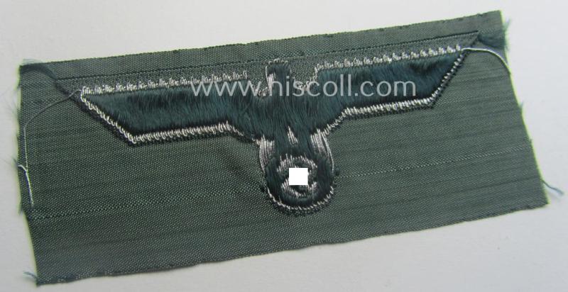 This is an attractive - and simply never used- nor cap-attached and actually not that easily encountered! - WH (Heeres) 'flatwire'-woven, officers'-type overseas cap-eagle (ie. 'Offiziersadler für Schiffchen') as was also intended for usage on the: 'Knautschmützen o. Alter-Art-Schirmmützen' ie. visor-caps and that comes in an overall very nice- (ie. simply never used- ie. 'virtually mint'-), condition. These desirable cap-eagles were intended for usage on the popular so-called: 'Knautschmützen' ie. 'Alter-art' visor-caps but saw also usage on the 'high-quality' officers'-type 'Schiffchen' (ie. side-caps). The eagle is executed in bright-silver-grey- ('flatwire'-type) thread on a field-grey-coloured background and comes in a non-used condition: it comes 'as straightly cut-of-the role' (as can be seen on the pictures). It should be noted that these attractive 'flatwire-woven'-type cap-eagles are seldomly offered for sale and can as such easily be graded 'fairly scarce'. Simply a great occasion to acquire an attractive piece of German cap-insignia for a competitive price!