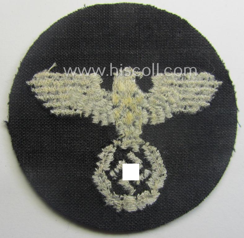 This is an attractive - and actually not that often seen! - WH (Luftwaffe)-related, so-called: 'Abzeichen für die Armbinde für Pförtner, Wächter und Fahrstuhlführer im Reichsluftfahrtministerium o. RLM' (or: specific armband-patch as was exclusively intended for usage by doormen, security- and/or elevator-staff serving within the air-ministry) and that comes in an overall nice- (albeit I deem used- ie. once armband-attached, condition. The black-toned- and woolen-based patch shows a silverish-white-coloured (and left-facing) eagle-device and has an approximate diameter of 5,7 cms. The piece is additionally backed with black-toned linnen (as can be noticed on the pictures). Simply a neat - and interesting! - specific armband-patch that saw usage by certain staff-members serving within the TR-period 'Reichsluftfahrtministerium o. RLM'!