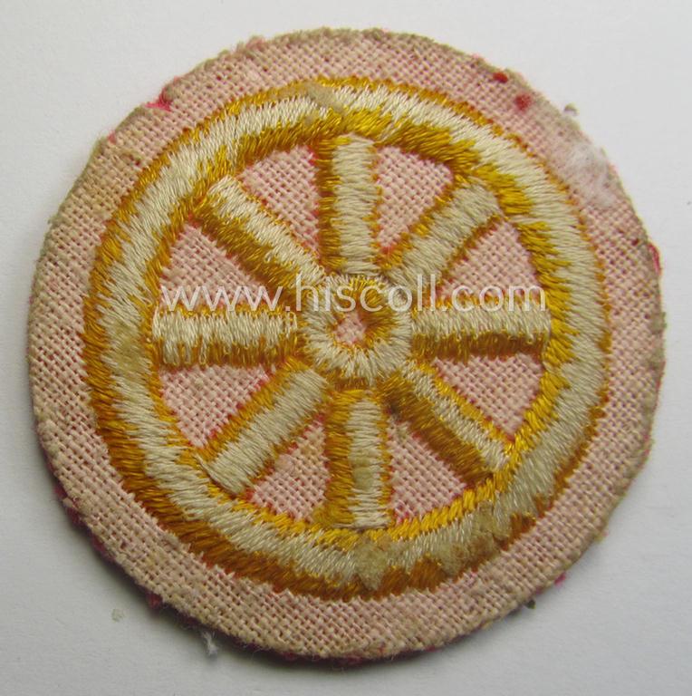 This is attractive example of a HJ ('Hitlerjugend') so-called: 'Motor-HJ Prüfungsabzeichen in Gold' (or: golden-class motor-proficiency badge) being a 'virtually mint ie. unissued' example that misses its (presumably once-attached) so-called: 'RzM'-etiket. The neat - smaller-sized badge having an approximate diameter of 3,2 cms. - is sometimes referred to as: 'HJ-Ausbildungsabzeichen' (aka: trainings-badge) was simply never used and just shows some minor staining caused by years of storage only. The patch is nicely 'backed' with white-coloured linnen as is more often the case (as can be seen on the pictures). This is the so-called: first- (ie. golden-) class pattern badge, as was executed in golden-yellow-coloured linnen onto a bright-pink-coloured- and/or woolen-based background. Simply an attractive - and actually not that often encountered! - youth-related proficiency-badge that will be very hard to be upgraded!