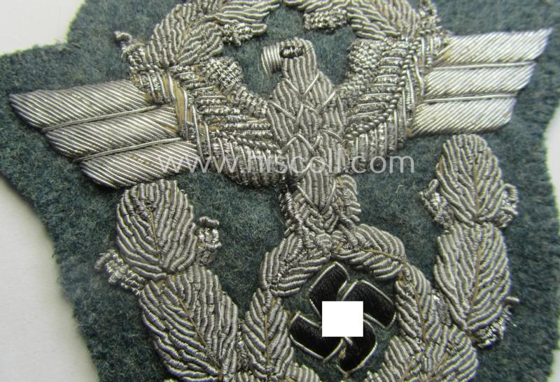 Truly used - and neatly hand-embroidered! - example of an officers'-pattern so-called: 'Polizei' (ie. police) arm-eagle (as executed in silver-toned braid!) and that comes in a moderately used- and/or worn, condition