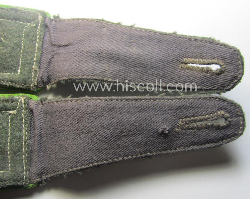 This is a truly very attractive - and as such actually very scarcely encountered! - fully matching pair of (typical) early- (ie. mid-war-period- or: 'M41 o. M43'-pattern) WH (Heeres) NCO-type shoulderstraps as piped in the neat bright-green- (ie. 'hellgrüner'-) coloured branchcolour as was specifically intended for usage by an: 'Oberfeldwebel eines Panzergrenadier-Regiments. o. Abteilungs' (or: NCO ie. sergeant first-class who served within an army infantry-related rifle-unit ie. regiment) and that comes in an overall very nice- (I deem issued albeit just minimally used- ie. worn-), condition. The neat shoulderstraps - which each measure approximately 11,4 cms. in length as more often - have the 'standard-pattern'- and/or typical, field-grey-coloured and/or woolen-based 'upperdecks' and come naturally mounted onto their original tongues (as can be seen on the pictures). The pair was just minimally worn and comes as found and/or stored for decades. The shoulderstraps - which show the neat and desirable, bright-green- (ie. 'hellgrüner'-) coloured and/or typical 'silk-like'-type piping attached - show the bluish-silverish-grey-coloured (ie. typically somewhat 'sub-dued') NCO-braid and two pairs of (fully matching, regular-sized and zinc-based) pips period-attached denoting that the NCO who wore these straps held the rank of an: 'Oberfeldwebel'. Simply a very attractive - and very desirable! - pair of mid-war-period so-called: 'M41 o. M43'-pattern-shoulderstraps as was intended for - and clearly worn by! - an: 'Oberfeldwebel eines Panzergrenadier-Regiments. o. Abteilungs': with certainty one of the most attractive 'Panzer-Grenadiere'-related NCO-shoulderstrap-pairs I had on offer for quite some time!