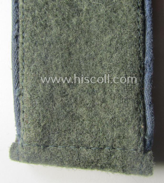 The neat - (I deem) early- (ie. mid-) war-period- ie. so-called: 'M41 o. M43'-pattern - enlisted-mens'-pattern, WH (Heeres) 'Nachschub'-related shoulderstrap is piped in the neat bright-blue- (ie. 'kornblumenblauer'-) coloured branchcolour and measures approximately 11,5 cms. in length: it has the neat bright-blue- (ie. 'kornblumenblauer'-) coloured- (and/or typical 'silk-like'-type-) piping attached (as is more often encountered with early- ie. mid-war-period straps). The strap - which was intended for usage by a: 'Soldat einer Nachschub-Abteilungs' (or: simple soldier and presumably driver who served with an army-transport-unit) - comes naturally mounted onto its functional tongue. Simply a neat early- (ie. mid-) war-period- (ie. 'M41 o. M43'-pattern), WH (Heeres) EM-type shoulderstrap that was worn and/or used by a: 'Soldat einer Nachschub-Abteilungs': too bad that it is only a single specimen!